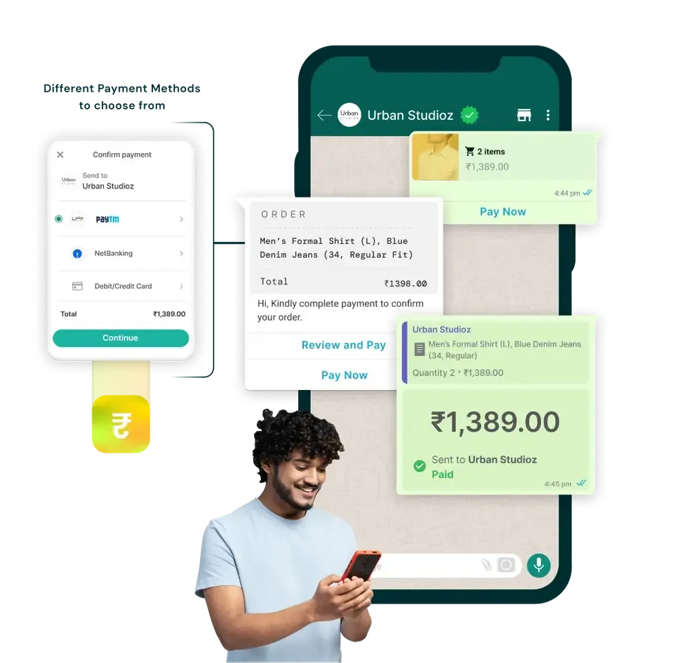 Users pay instantly via secure link on WhatsApp, no separate app or login required.